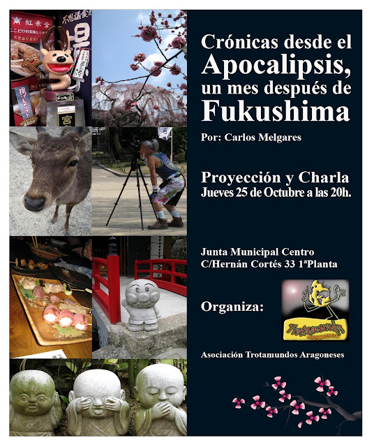 El pasado día 25 de Octubre tuve el placer de dar una charla sobre Japón,, un país que me enamora y me fascina, varias personas se interesaron sobre el contenido de la charla, así que os dejo por aquí un par de enlaces, con la charla y álbum de imágenes del viaje, gracias a la Asociación Trotamundos Aragoneses por pensar en mí para la exposición.